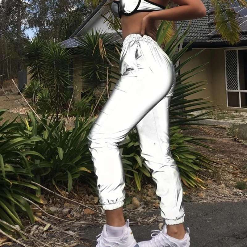 Special Offer Riflettente pantaloni delle donne di alta vita pantaloni danno pantaloni della tuta jogger punk pantaloni della tuta autunno inverno donna casual streetwear pantaloni Discount 38% Today!