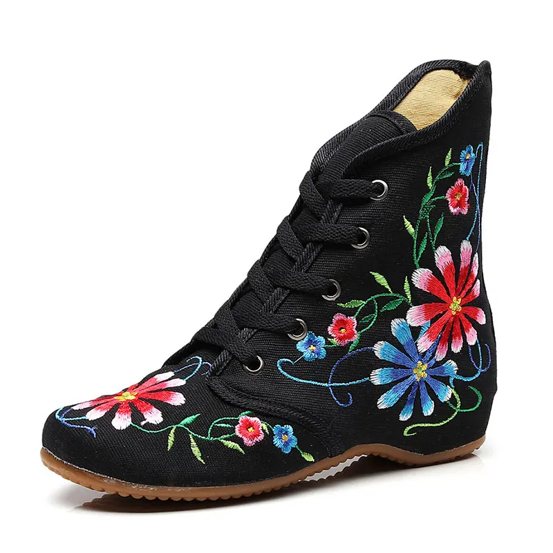 Product Name: Veowalk Retro Delle Donne Ricamato In Cotone Lace up Breve Stivali Piatti, Signore di Autunno Casual Cinese Del Ricamo Scarpe Comfort Stivaletti