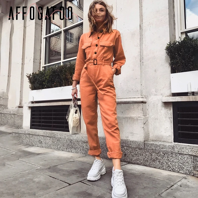 Special Offer Affogatoo casual cargo in cotone Arancione delle donne della tuta Sash tasca di sport pagliaccetto delle signore Chic autunno inverno femminile tute tuta Discount 48% Today!