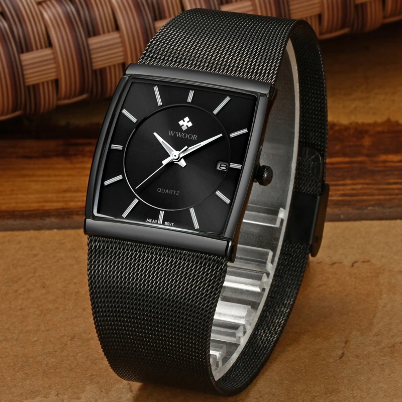 Product Name: WWOOR Uomini Orologi Top Brand di Lusso Piazza Orologio del Quarzo Degli Uomini Orologio Da Polso Impermeabile Nero Maglia di Acciaio di Affari di Sesso Maschile Orologio Da Polso Uomo regalo