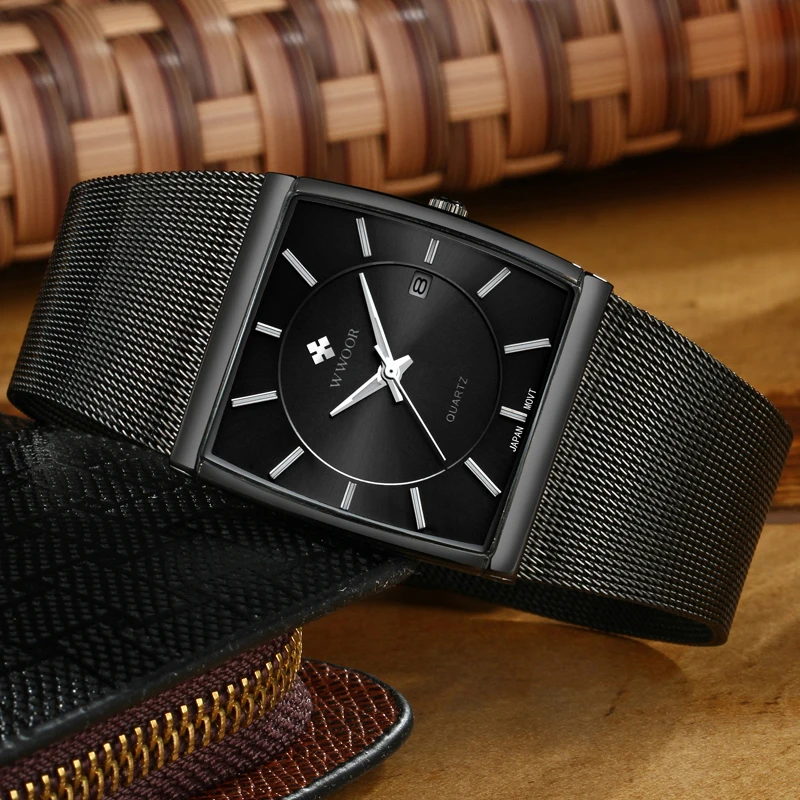 Special Offer WWOOR Uomini Orologi Top Brand di Lusso Piazza Orologio del Quarzo Degli Uomini Orologio Da Polso Impermeabile Nero Maglia di Acciaio di Affari di Sesso Maschile Orologio Da Polso Uomo regalo Discount 50% Today!