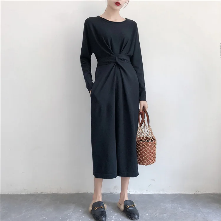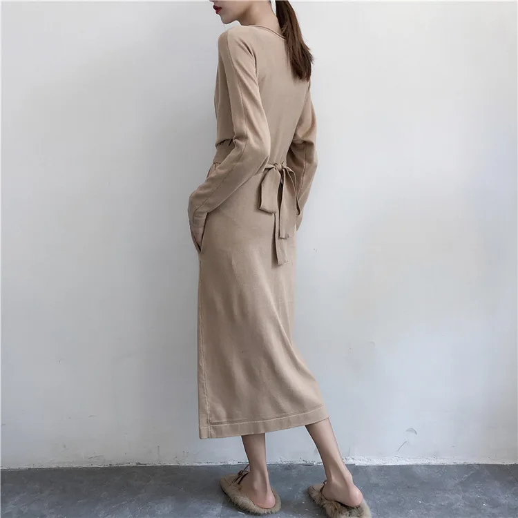 Product Name: LMCAVASUN delle Donne Elegante Manica Lunga Split Vestito di Autunno Abiti di Moda Femminile Della Signora Bow Tie Fiocchi e Fasce Solido Lungo Vestido